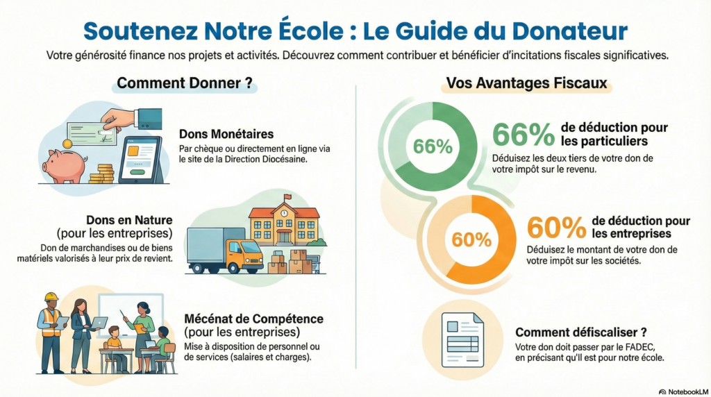 Le mécénat pour l’école MERCI !Nous remercions tous ceux qui aident notre école à travers ses projets et ses activités très nombreuses. Dons numéraires : site de la Direction Diocésaine de l’Enseignement CatholiqueDons en nature ou en compétence, compléter cette fiche : Attestation de don en nature ou en compétence